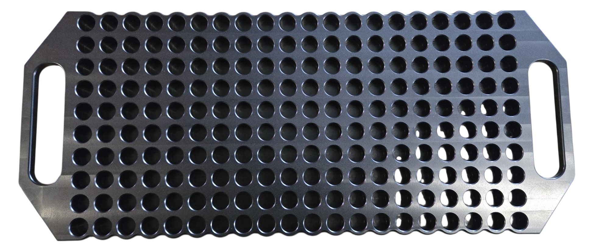 Bandeja de carga para 200 cartuchos fabricada en aluminio 7075 de alta resistencia, anodizado en color negro.